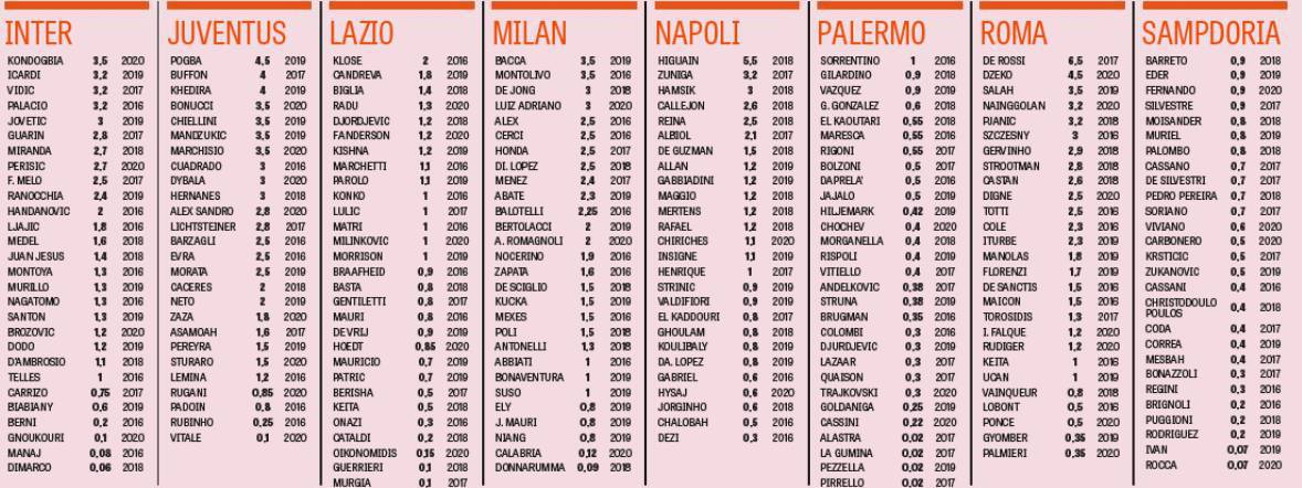 quello però che vorrei smitizzare è la convinzione che la lazio paghi molti piu stipendi inutili delle altre. questo non è vero. la lazio proprio per la sua prudenza intrinseca negli investimenti sui singoli calciatori, raramente "spreca" grandi risorse. basta dare un'occhiata alle tabelle postate sopra, un solo cole o uno zuniga coprono tutti gli esuberi della lazio in 10 anni di gestione. non esiste un DS a cui tutte le ciambelle riescono col buco, in tutte le società ci sono degli azzardi, delle scommesse, anche dei fallimenti, noi almeno abbiamo il pregio di farlo a costi molto bassi.